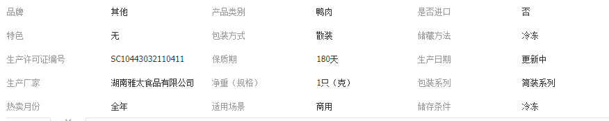 本网页所展示的有关【腊鸭子正宗湖南柴火烟熏农家散养成年鸭湘菜饭店批发约650g一只_鸭_湖南雅太食品有限公司】的信息/图片/参数等由赛皇云的会员【湖南雅太食品有限公司】提供,由赛皇云会员【湖南雅太食品有限公司】自行对信息/图片/参数等的真实性、准确性和合法性负责,本平台(本网站)仅提供展示服务,请谨慎交易,因交易而产生的法律关系及法律纠纷由您自行协商解决,本平台(本网站)对此不承担任何责任。您在本网页可以浏览【腊鸭子正宗湖南柴火烟熏农家散养成年鸭湘菜饭店批发约650g一只_鸭_湖南雅太食品有限公司】有关的信息/图片/价格等及提供【腊鸭子正宗湖南柴火烟熏农家散养成年鸭湘菜饭店批发约650g一只_鸭_湖南雅太食品有限公司】的商家公司简介、联系方式等信息。