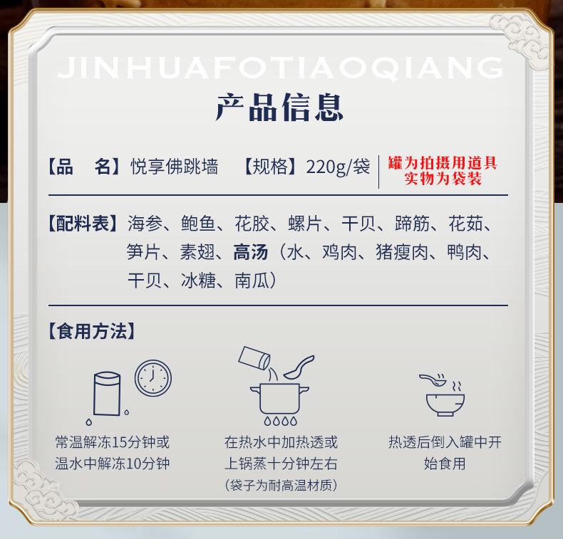 本网页所展示的有关【锦桦海佛跳墙批发悦享袋装酒店宴会即食半成品鲍鱼捞饭商用预制菜_速食方便食品_大连锦桦食品有限公司】的信息/图片/参数等由赛皇云的会员【大连锦桦食品有限公司】提供,由赛皇云会员【大连锦桦食品有限公司】自行对信息/图片/参数等的真实性、准确性和合法性负责,本平台(本网站)仅提供展示服务,请谨慎交易,因交易而产生的法律关系及法律纠纷由您自行协商解决,本平台(本网站)对此不承担任何责任。您在本网页可以浏览【锦桦海佛跳墙批发悦享袋装酒店宴会即食半成品鲍鱼捞饭商用预制菜_速食方便食品_大连锦桦食品有限公司】有关的信息/图片/价格等及提供【锦桦海佛跳墙批发悦享袋装酒店宴会即食半成品鲍鱼捞饭商用预制菜_速食方便食品_大连锦桦食品有限公司】的商家公司简介、联系方式等信息。