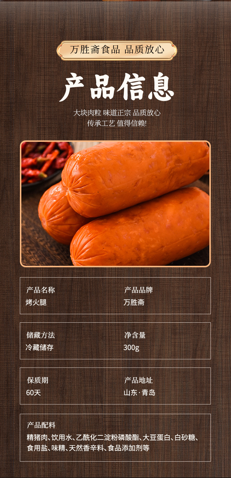 本网页所展示的有关【烤香火腿肠300g美味火腿肠午餐肉烤圆青岛老火腿家用即食批发_速食方便食品_青岛万胜斋食品有限公司】的信息/图片/参数等由赛皇云的会员【青岛万胜斋食品有限公司】提供,由赛皇云会员【青岛万胜斋食品有限公司】自行对信息/图片/参数等的真实性、准确性和合法性负责,本平台(本网站)仅提供展示服务,请谨慎交易,因交易而产生的法律关系及法律纠纷由您自行协商解决,本平台(本网站)对此不承担任何责任。您在本网页可以浏览【烤香火腿肠300g美味火腿肠午餐肉烤圆青岛老火腿家用即食批发_速食方便食品_青岛万胜斋食品有限公司】有关的信息/图片/价格等及提供【烤香火腿肠300g美味火腿肠午餐肉烤圆青岛老火腿家用即食批发_速食方便食品_青岛万胜斋食品有限公司】的商家公司简介、联系方式等信息。