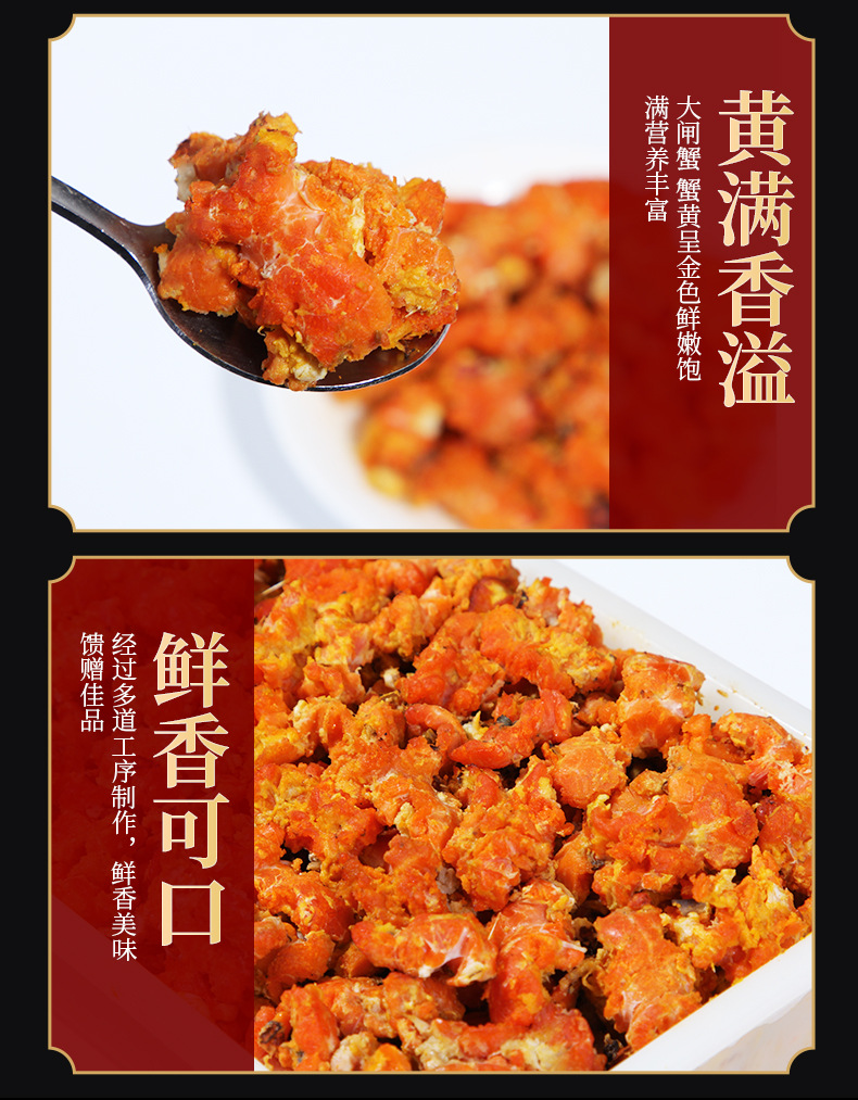 本网页所展示的有关【活蟹现拆大螃蟹纯蟹黄500g新鲜冷冻真空秃黄油蟹黄酱原料纯蟹黄_海水蟹_南京惠诺食品有限公司】的信息/图片/参数等由赛皇云的会员【南京惠诺食品有限公司】提供,由赛皇云会员【南京惠诺食品有限公司】自行对信息/图片/参数等的真实性、准确性和合法性负责,本平台(本网站)仅提供展示服务,请谨慎交易,因交易而产生的法律关系及法律纠纷由您自行协商解决,本平台(本网站)对此不承担任何责任。您在本网页可以浏览【活蟹现拆大螃蟹纯蟹黄500g新鲜冷冻真空秃黄油蟹黄酱原料纯蟹黄_海水蟹_南京惠诺食品有限公司】有关的信息/图片/价格等及提供【活蟹现拆大螃蟹纯蟹黄500g新鲜冷冻真空秃黄油蟹黄酱原料纯蟹黄_海水蟹_南京惠诺食品有限公司】的商家公司简介、联系方式等信息。
