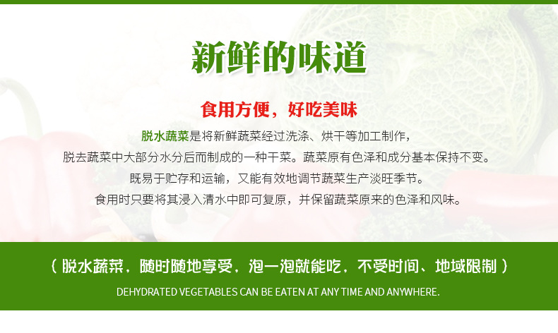 相比较其它鲜菜而言,脱水蔬菜具有体积小、重量轻、入水便会复原、运输食用方便等特点。食用时不仅味美、色鲜,而且能保持原有的价值。
