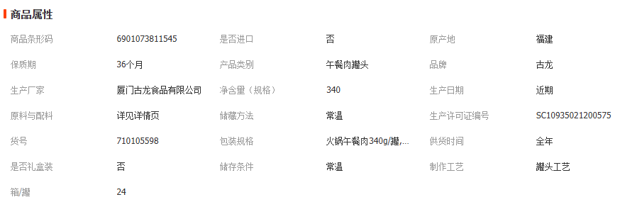 本网页所展示的有关【古龙食品火锅午餐肉罐头户外早餐煎饼即食正品猪肉火腿肉340g_罐头食品_厦门古龙食品有限公司】的信息/图片/参数等由赛皇云的会员【厦门古龙食品有限公司】提供,由赛皇云会员【厦门古龙食品有限公司】自行对信息/图片/参数等的真实性、准确性和合法性负责,本平台(本网站)仅提供展示服务,请谨慎交易,因交易而产生的法律关系及法律纠纷由您自行协商解决,本平台(本网站)对此不承担任何责任。您在本网页可以浏览【古龙食品火锅午餐肉罐头户外早餐煎饼即食正品猪肉火腿肉340g_罐头食品_厦门古龙食品有限公司】有关的信息/图片/价格等及提供【古龙食品火锅午餐肉罐头户外早餐煎饼即食正品猪肉火腿肉340g_罐头食品_厦门古龙食品有限公司】的商家公司简介、联系方式等信息。