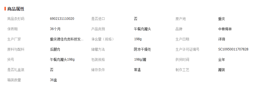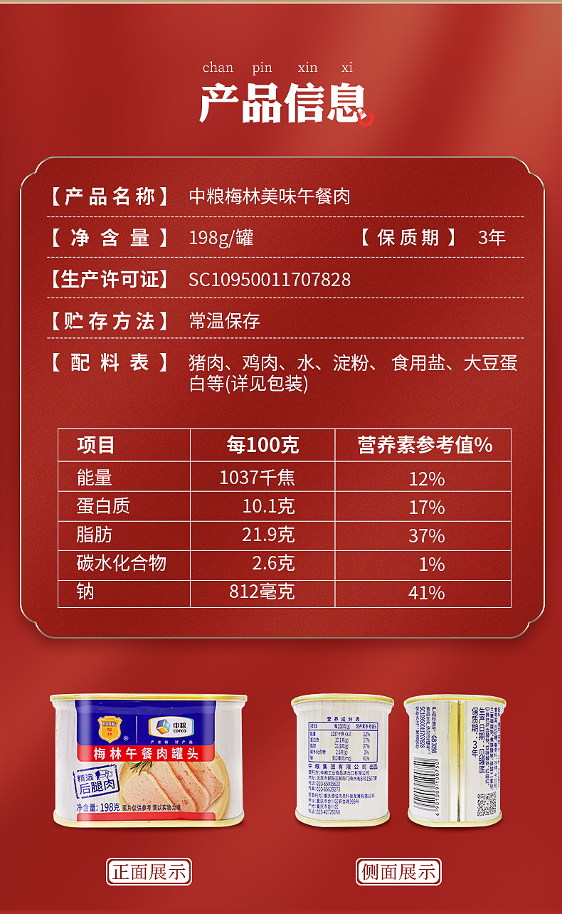 本网页所展示的有关【中粮梅林午餐肉罐头198g批发火锅火腿肠熟食即食猪肉罐装_罐头食品_北京悦庆吉商贸有限公司】的信息/图片/参数等由赛皇云的会员【北京悦庆吉商贸有限公司】提供,由赛皇云会员【北京悦庆吉商贸有限公司】自行对信息/图片/参数等的真实性、准确性和合法性负责,本平台(本网站)仅提供展示服务,请谨慎交易,因交易而产生的法律关系及法律纠纷由您自行协商解决,本平台(本网站)对此不承担任何责任。您在本网页可以浏览【中粮梅林午餐肉罐头198g批发火锅火腿肠熟食即食猪肉罐装_罐头食品_北京悦庆吉商贸有限公司】有关的信息/图片/价格等及提供【中粮梅林午餐肉罐头198g批发火锅火腿肠熟食即食猪肉罐装_罐头食品_北京悦庆吉商贸有限公司】的商家公司简介、联系方式等信息。