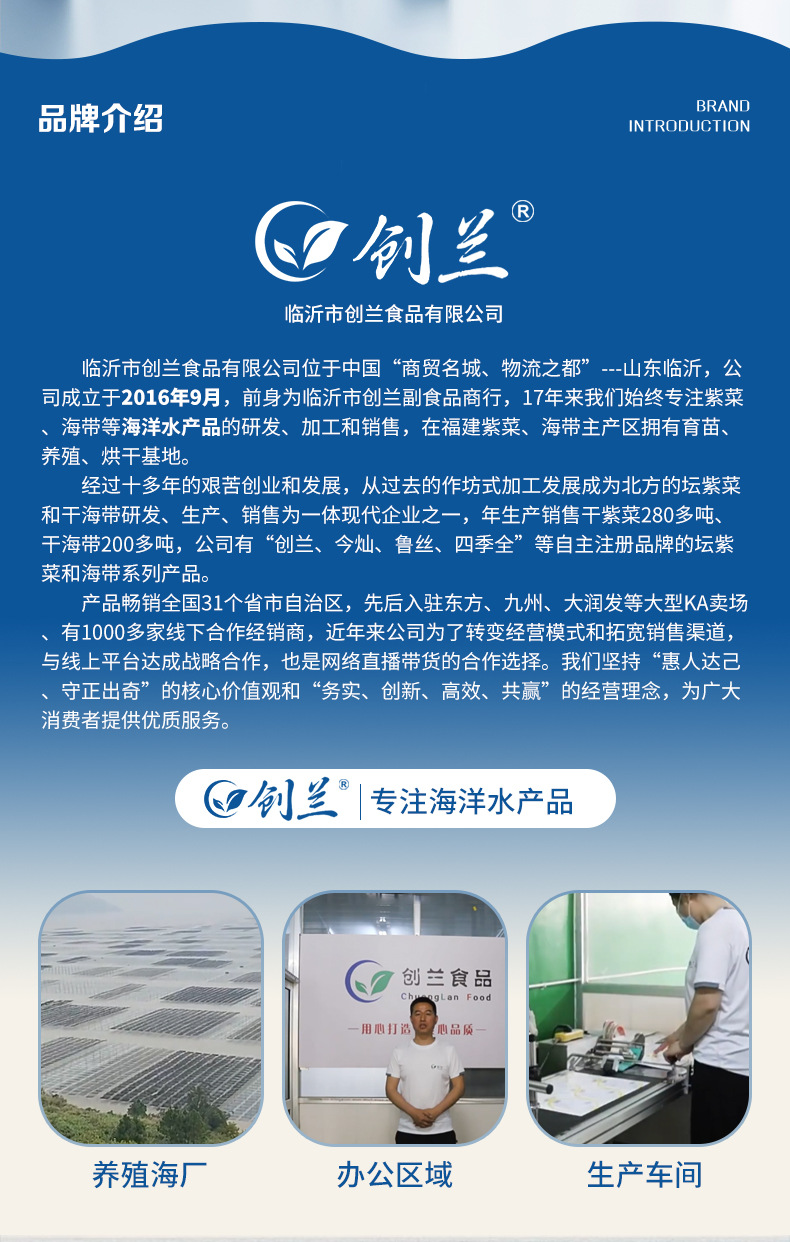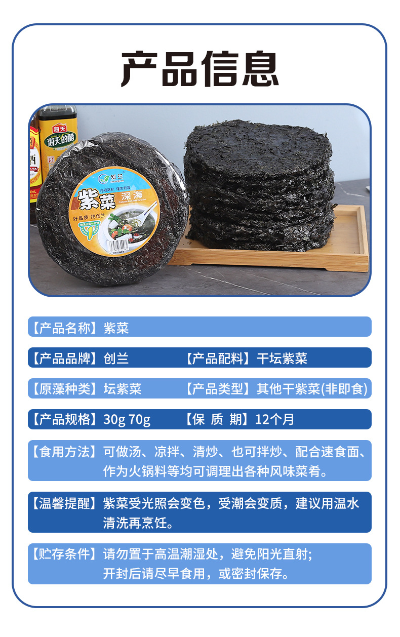 本网页所展示的有关【厂家批发霞浦紫菜多规格无沙头水免洗餐饮食堂饭店霞浦特产紫菜_水产干货_临沂市创兰食品有限公司】的信息/图片/参数等由赛皇云的会员【临沂市创兰食品有限公司】提供,由赛皇云会员【临沂市创兰食品有限公司】自行对信息/图片/参数等的真实性、准确性和合法性负责,本平台(本网站)仅提供展示服务,请谨慎交易,因交易而产生的法律关系及法律纠纷由您自行协商解决,本平台(本网站)对此不承担任何责任。您在本网页可以浏览【厂家批发霞浦紫菜多规格无沙头水免洗餐饮食堂饭店霞浦特产紫菜_水产干货_临沂市创兰食品有限公司】有关的信息/图片/价格等及提供【厂家批发霞浦紫菜多规格无沙头水免洗餐饮食堂饭店霞浦特产紫菜_水产干货_临沂市创兰食品有限公司】的商家公司简介、联系方式等信息。