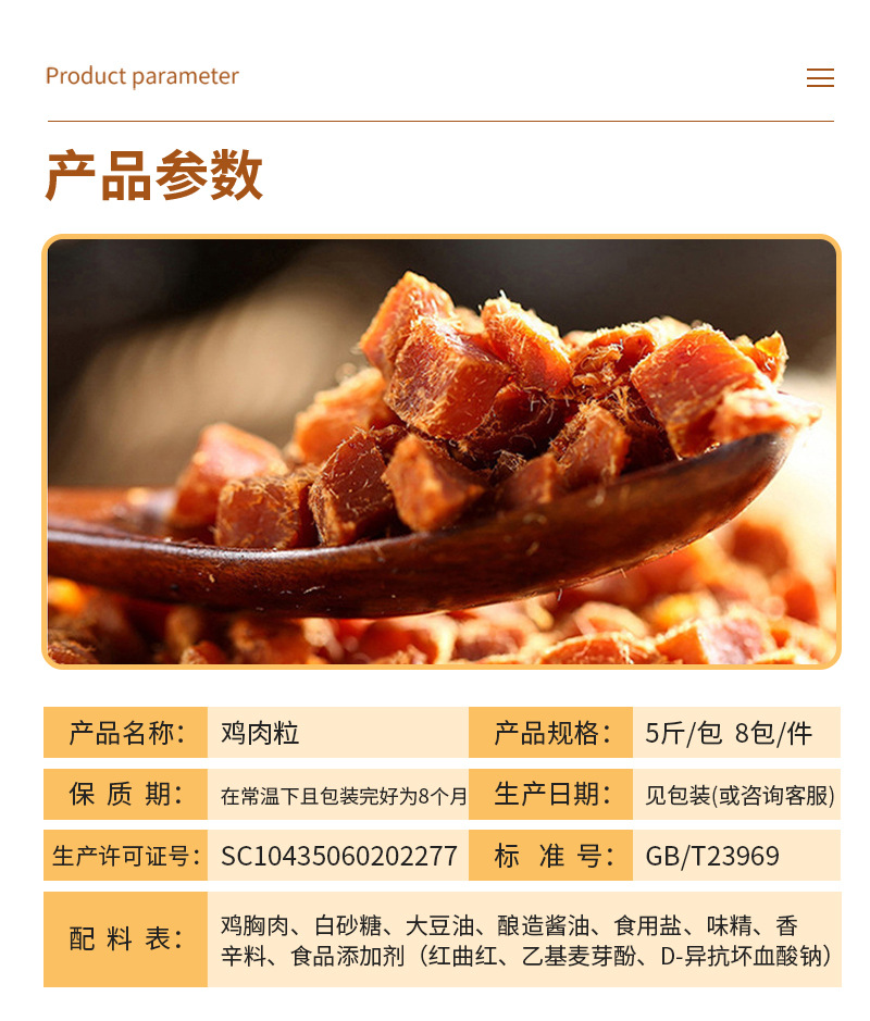 本网页所展示的有关【焙烤鸡肉粒高蛋白鸡胸肉粒五仁月饼馅料用烘焙肉粒5斤厂家批发_休闲食品_深圳市嘉焙食品有限公司】的信息/图片/参数等由赛皇云的会员【深圳市嘉焙食品有限公司】提供,由赛皇云会员【深圳市嘉焙食品有限公司】自行对信息/图片/参数等的真实性、准确性和合法性负责,本平台(本网站)仅提供展示服务,请谨慎交易,因交易而产生的法律关系及法律纠纷由您自行协商解决,本平台(本网站)对此不承担任何责任。您在本网页可以浏览【焙烤鸡肉粒高蛋白鸡胸肉粒五仁月饼馅料用烘焙肉粒5斤厂家批发_休闲食品_深圳市嘉焙食品有限公司】有关的信息/图片/价格等及提供【焙烤鸡肉粒高蛋白鸡胸肉粒五仁月饼馅料用烘焙肉粒5斤厂家批发_休闲食品_深圳市嘉焙食品有限公司】的商家公司简介、联系方式等信息。