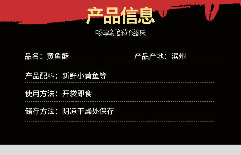 本网页所展示的有关【香酥小黄鱼即食小鱼干解馋海味零食孕妇小吃休闲食品鱼仔 黄鱼酥_休闲食品_山东渔公渔婆海产品有限公司】的信息/图片/参数等由赛皇云的会员【山东渔公渔婆海产品有限公司】提供,由赛皇云会员【山东渔公渔婆海产品有限公司】自行对信息/图片/参数等的真实性、准确性和合法性负责,本平台(本网站)仅提供展示服务,请谨慎交易,因交易而产生的法律关系及法律纠纷由您自行协商解决,本平台(本网站)对此不承担任何责任。您在本网页可以浏览【香酥小黄鱼即食小鱼干解馋海味零食孕妇小吃休闲食品鱼仔 黄鱼酥_休闲食品_山东渔公渔婆海产品有限公司】有关的信息/图片/价格等及提供【香酥小黄鱼即食小鱼干解馋海味零食孕妇小吃休闲食品鱼仔 黄鱼酥_休闲食品_山东渔公渔婆海产品有限公司】的商家公司简介、联系方式等信息。