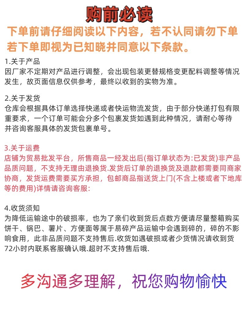 饼干属于易碎品,我们会尽力包装,但是运输过程中依然无法保证饼干百分百不碎,介意的请勿购买。